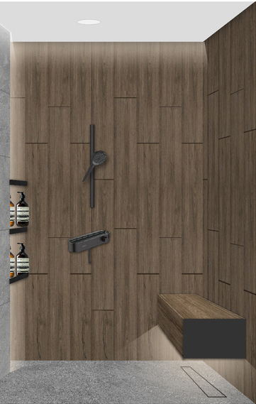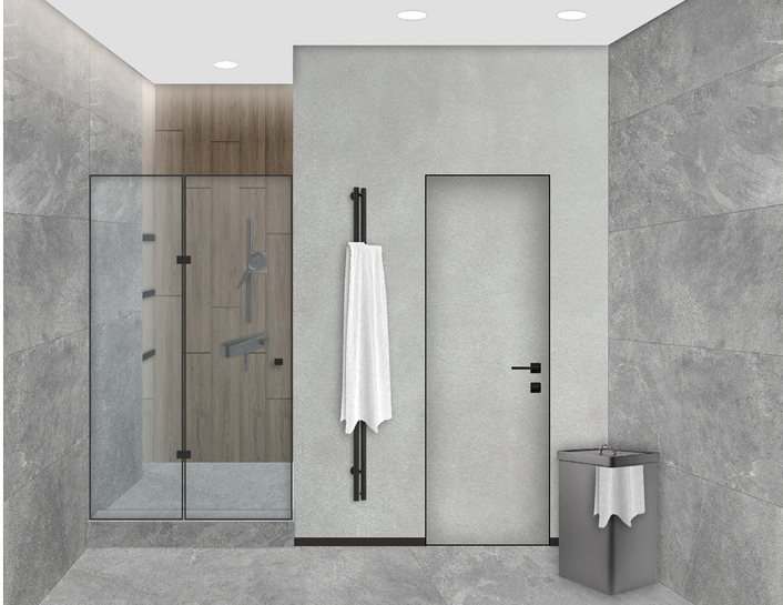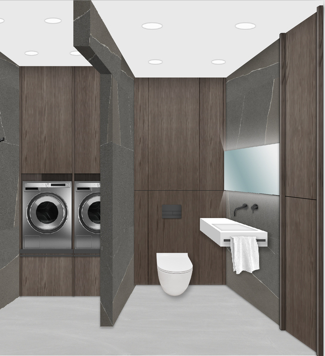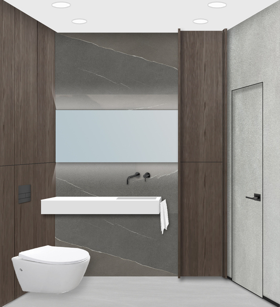Душевая зона - важная точка проекта, где сошлись лаконичность форм, брутальность и динамика отделки. За основу был взят керамогранит под камень со смелыми хаотичными линиями, который контрастирует с теплом и покоем тёмного дерева.