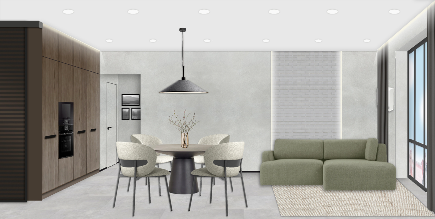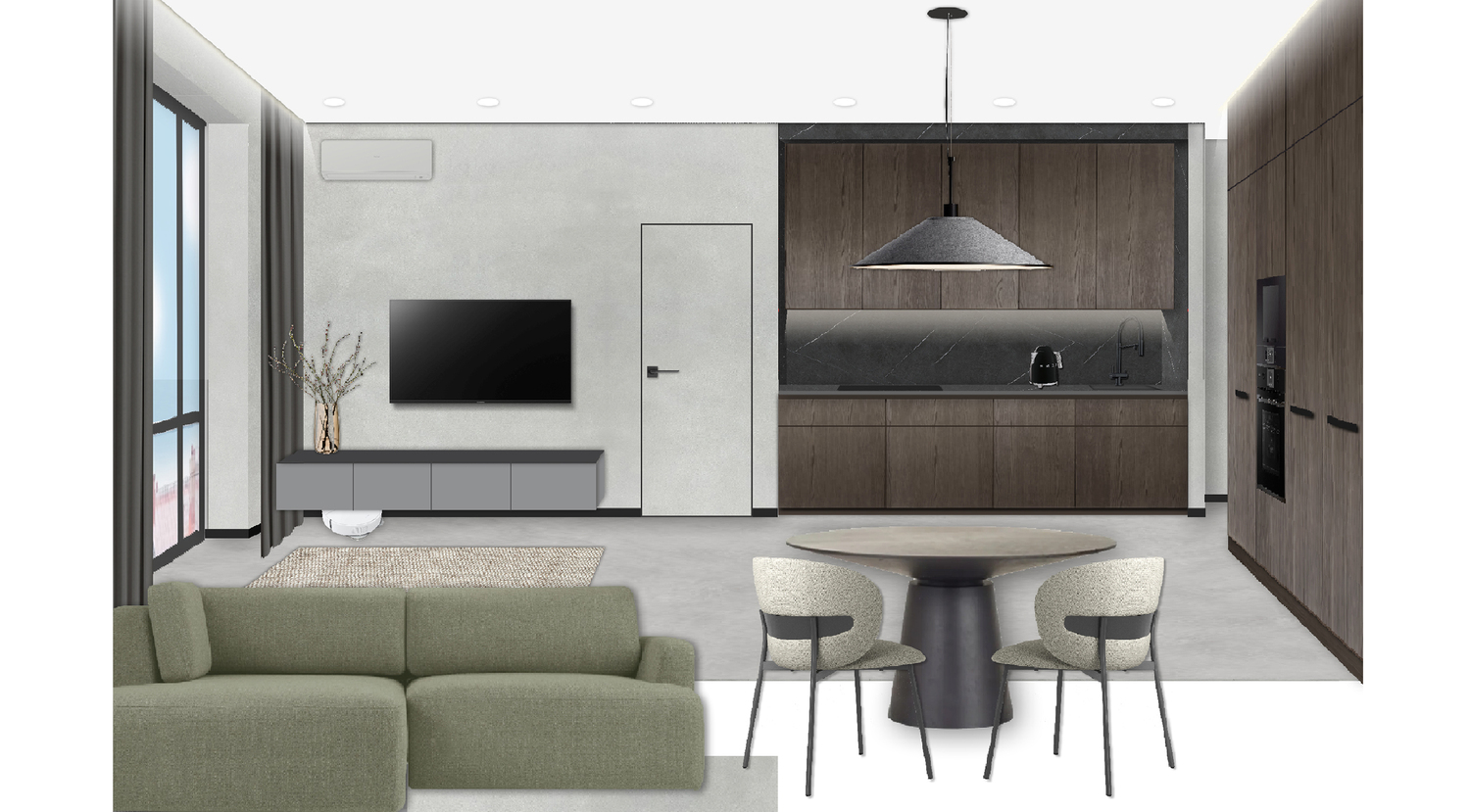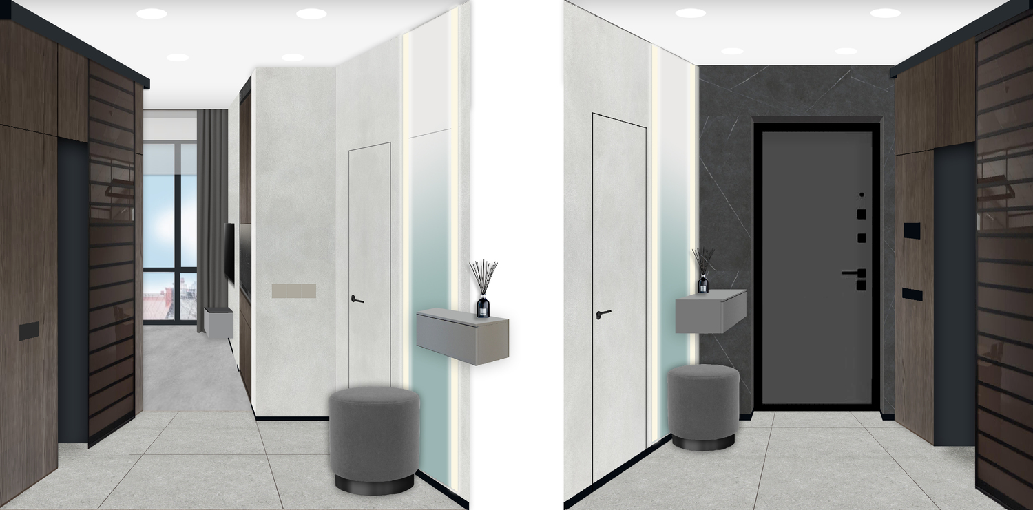 Материалы как основа характера: Мы воплотили настроение «ловта» в деталях — массивные металлические конструкции откатных перегородок прихожей и спальни, фактурное тёмное дерево, маскирующее вместительные зоны хранения едиными визуальными объёмами, пол из микроцемента и замшевая окраска стен, объединяет пространство за счёт низкого контраста и отсылает к «бетону», оставаясь при этом тактильно приятными.