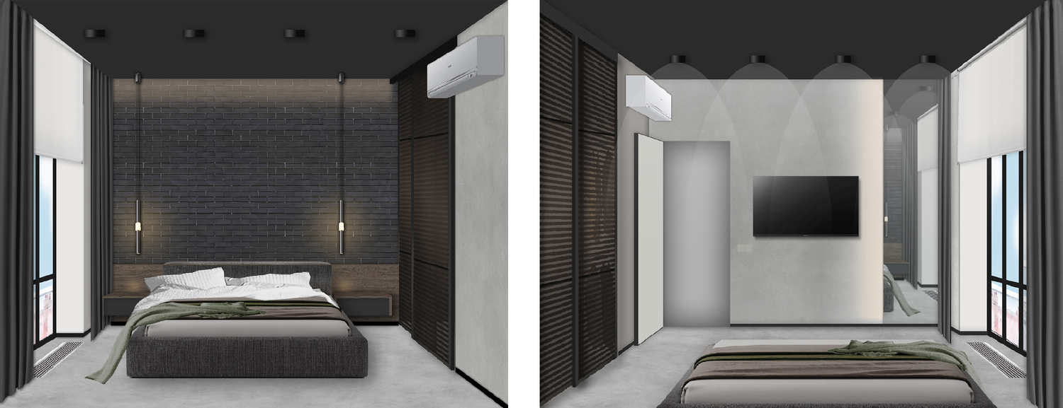 Спальня стала местом реализации мечты заказчиков об обволакивающем настроении. Сценарии приглушённого освещения, чёрный потолок и акцентная стена из кирпича, который мы «пригласили» с отделки фасада дома — всё это подарит таинственную атмосферу. Приём с зеркалом напротив кровати увеличит количество воздуха и света днём, а вечером в нем будет отражаться закатное солнце.