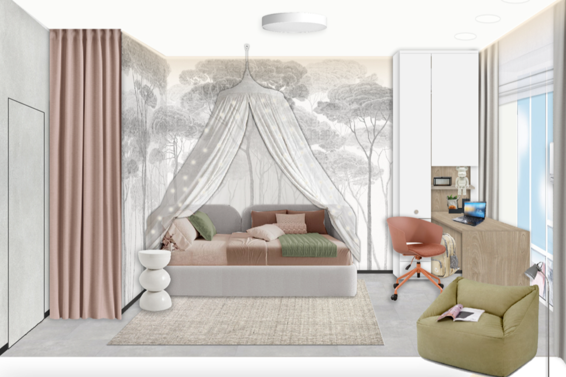 Основой дизайна детской стала фреска с деревьями, которая является художественным продолжением прекрасного вида из окна на Хехцир . Эта идея, объединенная с кроватью-шалашом, создает для ребенка ощущение сказочного лагеря в лесу. Проект универсален и рассчитан на годы: нейтральная цветовая гамма подойдет как для девочки, так и для мальчика, а продуманная электрика заложила основу для зонирования комнаты на двоих детей в будущем.